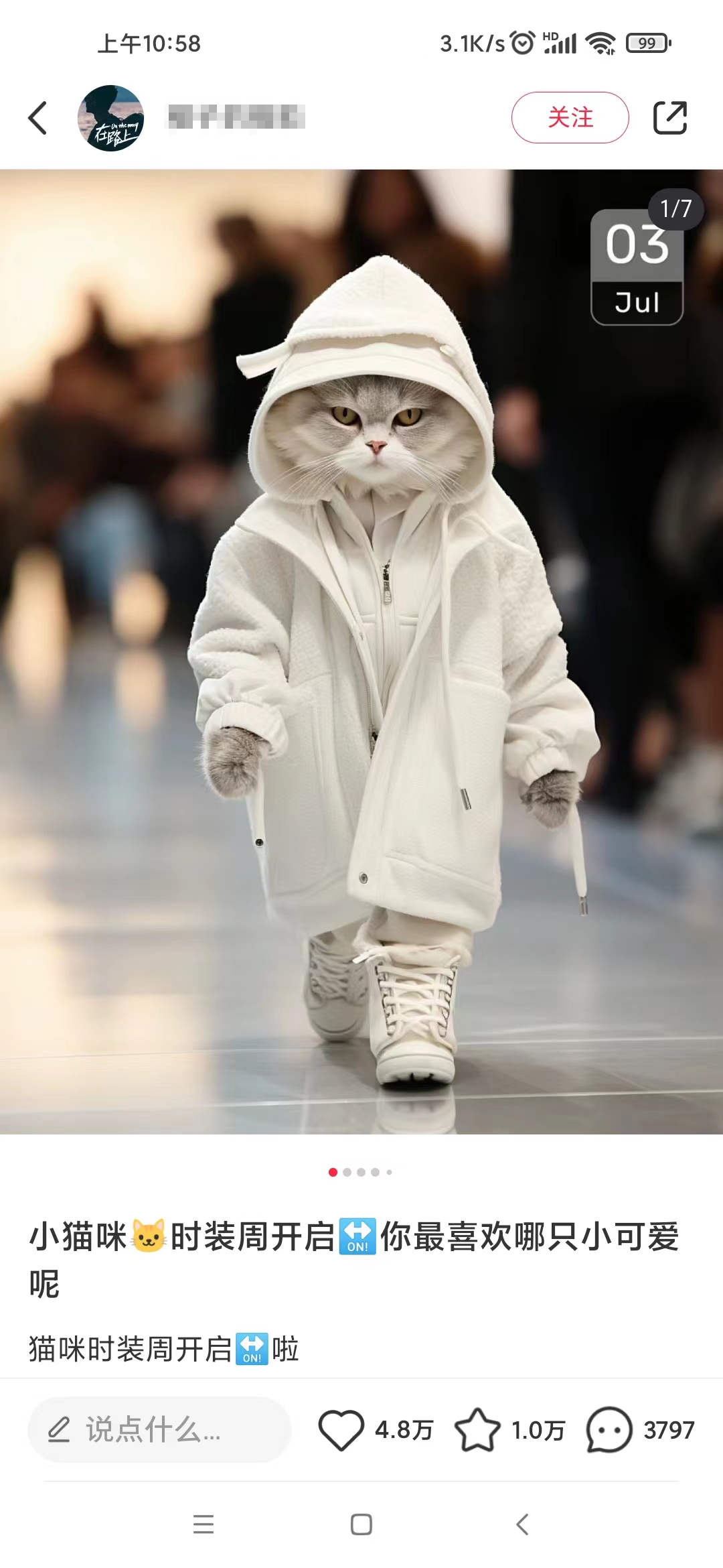 Animal秀在小红书上是非常*的项目,动不动就几万的赞,笔记的内容主要是猫咪走秀搭配一段文案,就是一只猫穿着人类的衣服在走T台,看起来非常的新奇特,加上小红书的主要用户群体是女性用户,女大学生,少女,宝妈这类,而大部分女性都是比较喜欢猫咪这类动物,加上我们的猫咪图片非常的可爱或者酷帅,很难不爱。